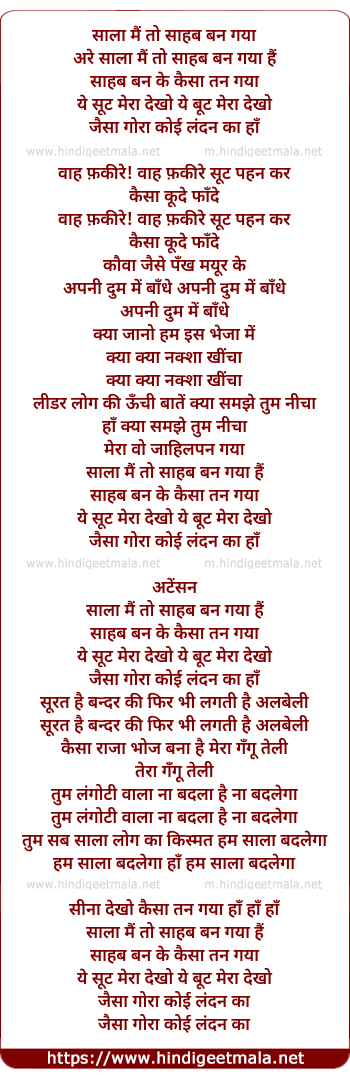 Lyrics of Saalaa Main To Saahab Ban Gayaa - साला मैं तो साहब बन गया