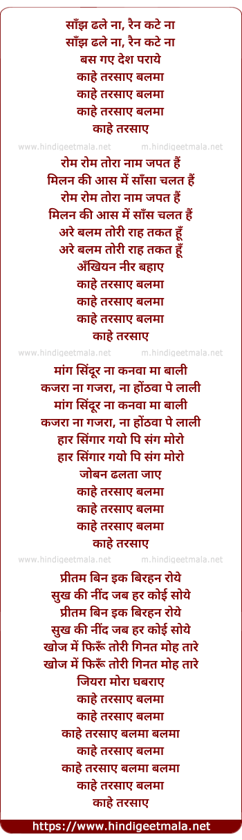 Lyrics of Saanjh Dhale Na - साँझ ढले ना, रैन कटे ना