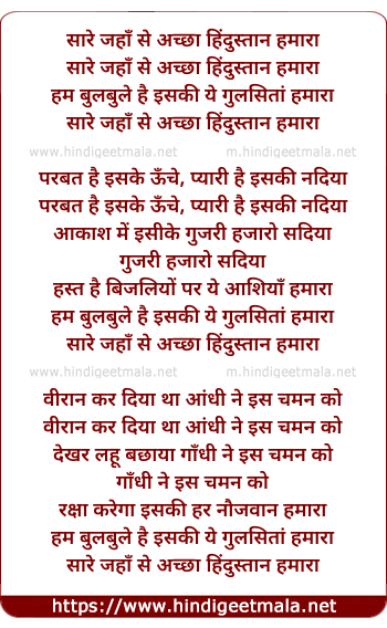 Lyrics of Saare Jaha Se Achha Hindustan Hamara - सारे जहाँ से अच्छा हिंदुस्तान हमारा