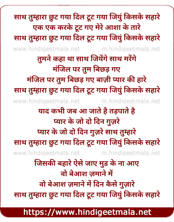 Lyrics of Saath Tumhara Choot Gaya - साथ तुम्हारा छुट गया दिल टूट गया जियुं किसके सहारे