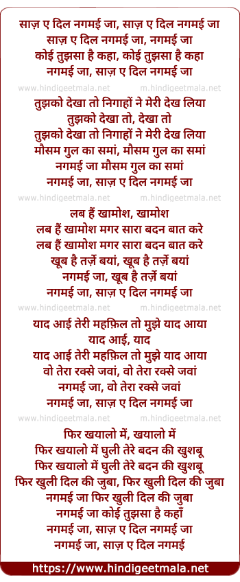 Lyrics of Saaz E Dil Nagmai Ja - साज़ ए दिल नगमई जा