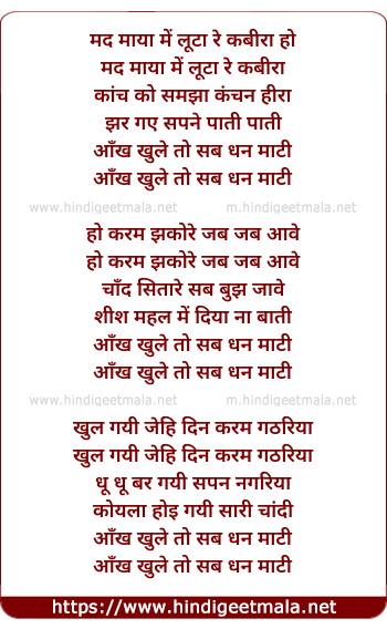 Lyrics of Sab Dhan Maati (Duet) - मद माया में लूटा रे कबीरा हो