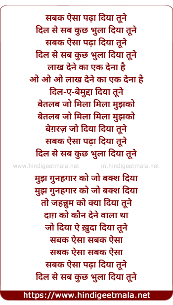 Lyrics of Sabak Aisaa Padhaa Diyaa Tune - सबक ऐसा पढ़ा दिया तूने