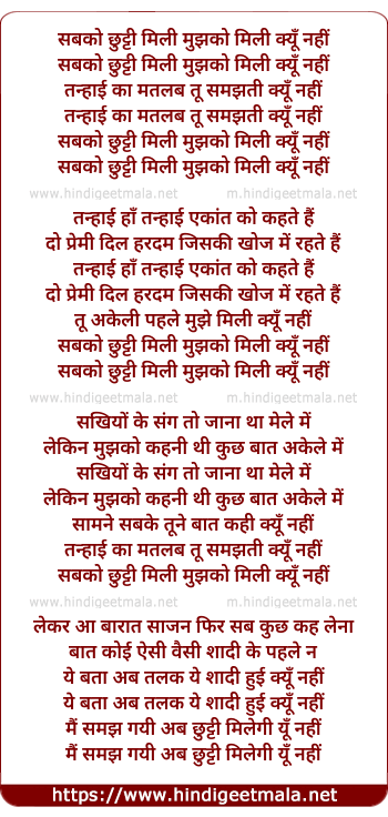 Lyrics of Sabko Chutti Mili Mujhko Mili Kyu Nahi - सबको छुट्टी मिली मुझको मिली क्यूँ नहीं