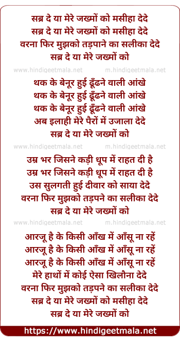Lyrics of Sabr De Ya Mere Zakhmon Ko - II - सब्र दे या मेरे जख्मों को