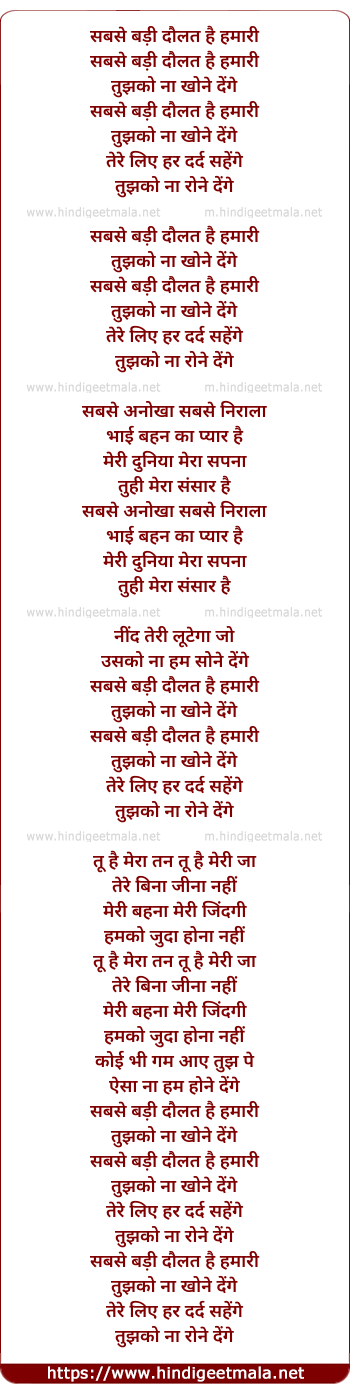 Lyrics of Sabse Badi Daulat Hai Hamari - सबसे बड़ी दौलत है हमारी