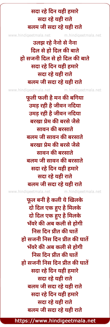 Lyrics of Sada Rahe Din Yahi Hamare - सदा रहे दिन यही हमारे