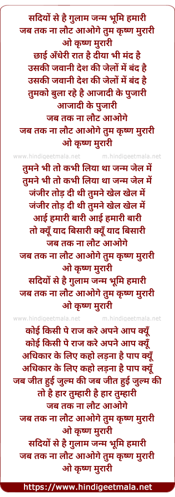 Lyrics of Sadiyo Se Hai Ghulam Janm Bhumi Hamari - सदियों से है गुलाम जन्म भूमि हमारी