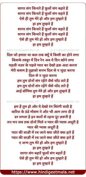 Lyrics of Sagar Sang Kinare Hai Phulo Sang Bahaare Hai - सागर संग किनारे हैं फूलों संग बहारे हैं