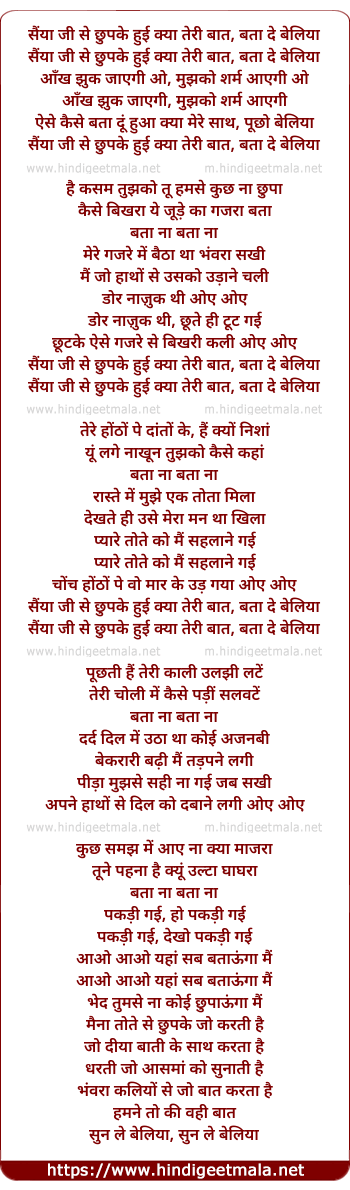 sainya ji se chhupke huyi kya teri baat, bata de de beliya