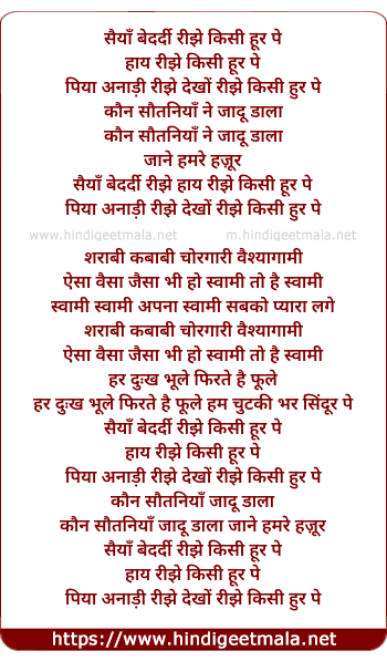 Lyrics of Saiya Bedardi Reejhe Kisi Hoor Pe - सैयाँ बेदर्दी रीझे किसी हूर पे