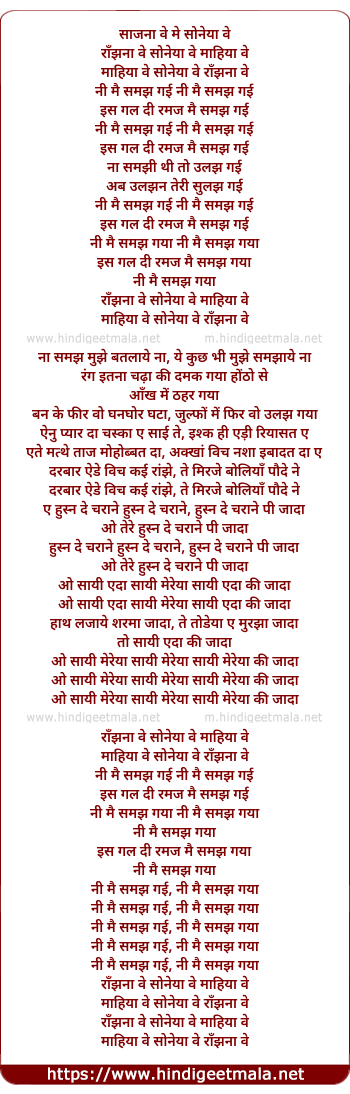 Lyrics of Sajana Ve Me Soneya Ve - साजना वे मे सोनेया वे