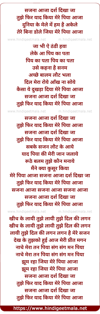 Lyrics of Sajna Aaja Darsh Dikha Ja Tujhe Fir Yad Kiya - सजना आजा दर्श दिखा जा तुझे फिर याद किया