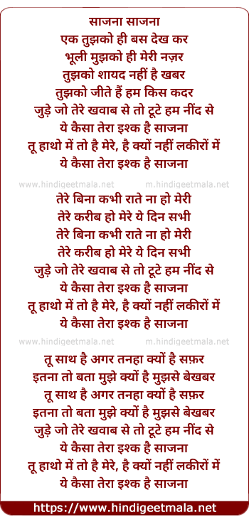 Lyrics of Saajna Dekh Tujhko Hi Bas Dekh Kar - साजना एक तुझको ही बस देख कर