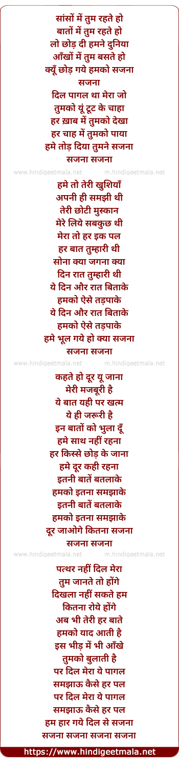Lyrics of Sajna - सांसों में तुम रहते हो