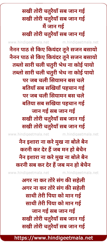Lyrics of Sakhi Tori Chaturiya Sab Jaan Gayi - सखी तोरी चतुरैयाँ सब जान गई