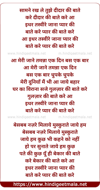 Lyrics of Samne Rakh Le Tujhe Didaar Ki Baate Kare - सामने रख ले तुझे दीदार की बाते करे