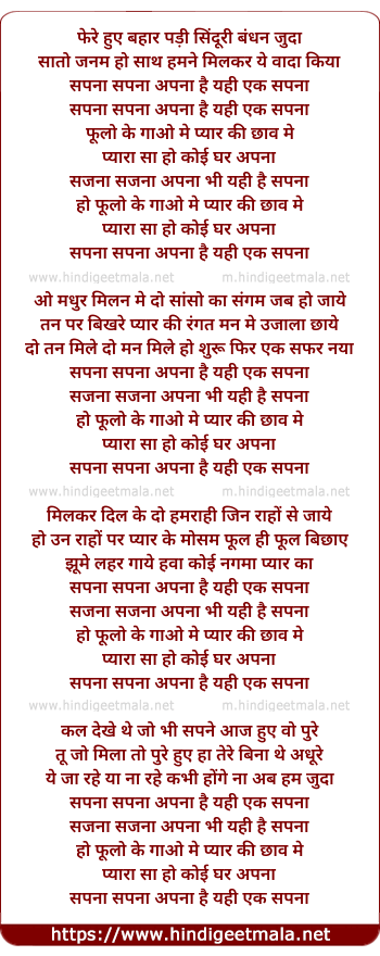Lyrics of Sapna Sapna Apna Hai Yahi Ek Sapna - सपना सपना अपना है यही एक सपना