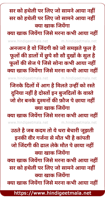 Lyrics of Sar Ko Hatheli Par Liye - सर को हथेली पर लिए