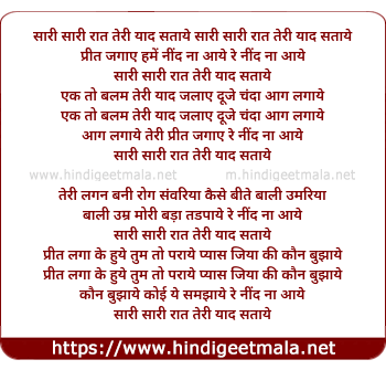 Lyrics of Sari Sari Rat Teri Yad Sataye - सारी सारी रात तेरी याद सताये