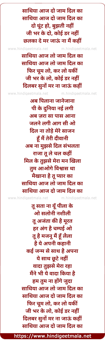 Lyrics of Sathiya Aaj Lo Jaam Dil Ka - साथिया आज लो जाम दिल का