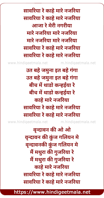 Lyrics of Sawariya Re Kahe More Nazariya - सावरिया रे काहे मारे नजरिया