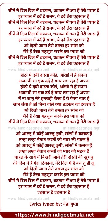 Lyrics of Seene Me Dil (Female) - सीने में दिल दिल में धडकन, धडकन में क्या हैं तेरी प्यास हैं