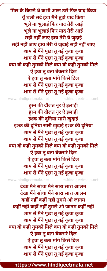 Lyrics of Shaam Se Maine Poocha - मिल के बिछड़े थे कभी आज उसे फिर याद किया