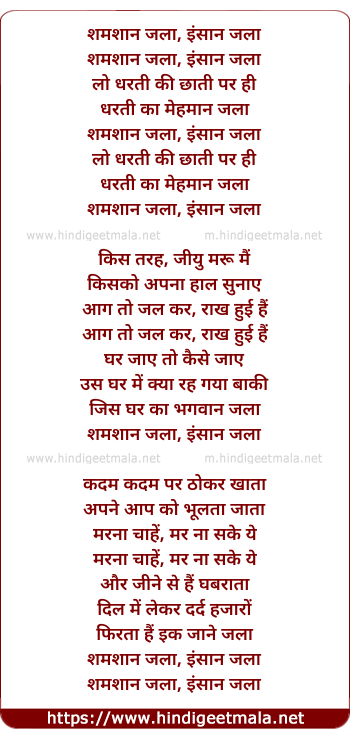 Lyrics of Shamshan Jala Insaan Jala - शमशान जला इंसान जला