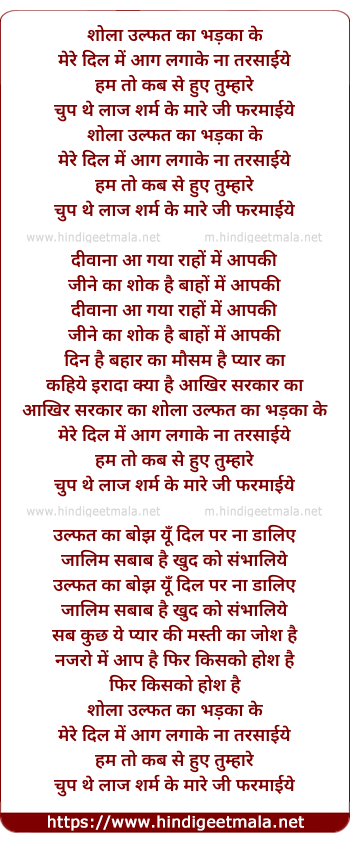 Lyrics of Shola Ulfat Ka Bhadka Ke Mere Dil Me Aag Laga Ke - शोला उल्फत का भड़का के मेरे दिल में आग लगा के