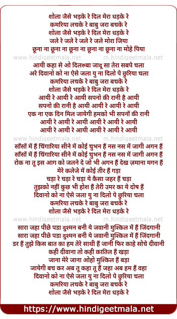 Lyrics of Sholaa Jaise Bhadake Re, Kamariyaa Lachake Re - शोला जैसे भड़के रे कमरिया लचके रे