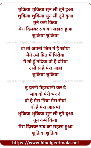 Lyrics of Shukriya Shukriya Sun Li Tune Dua - शुक्रिया शुक्रिया सुन ली तूने दुआ