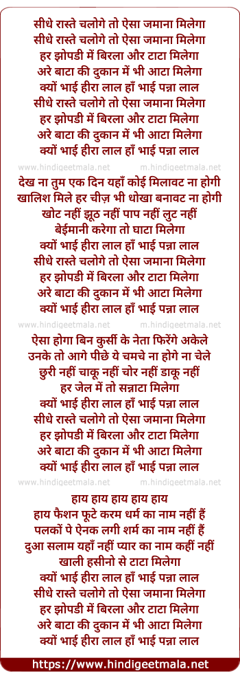 Lyrics of Sidhe Raste Chaloge To Aisa Jamana Milega - सीधे रास्ते चलोगे तो ऐसा जमाना मिलेगा