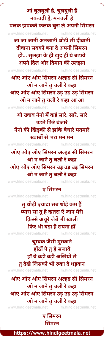 Film CastAneesha Joshi, Hiten Kumar, Kangana Ranaut, Kavi Shastri, Kishori Shahane, Mark Justice, Rajiv Nema, Rupinder Nagra, Sohum ShahSingerGuru Randhawa, Jonita Gandhi, Sunidhi Chauhan, Arijit Singh, Shalmali Kholgade, Divya Kumar, Jigar SaraiyaLyricistVayu, Priya SaraiyaMusic BySachin JigarDirectorHansal MehtaProducerAmit Agarwal, Bhushan Kumar, Krishan Kumar, Shailesh R. SinghExternal LinksSimran at IMDB Simran at WikipediaYouTubeSimran at YT