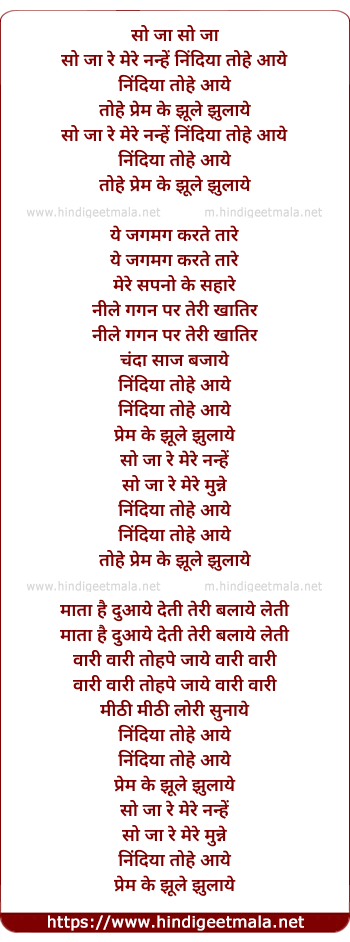 Lyrics of So Ja Mere Nanhe Nindiya Tohe Aaye - सो जा सो जा