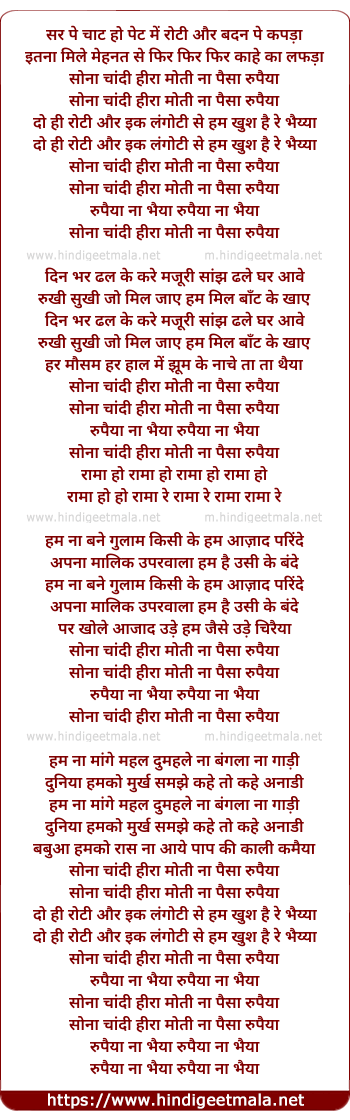 Lyrics of Sona Chandi Heera Moti Na Paisa Rupaiya - सोना चांदी हीरा मोती ना पैसा रुपैया