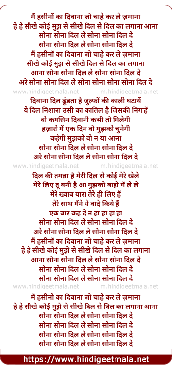 Lyrics of Sona Sona Dil Le, Sona Sona Dil De - सोना सोना दिल ले, सोना सोना दिल दे