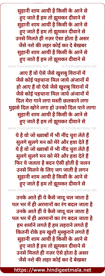 Lyrics of Suhani Sham Aayi Hai Kisi Ke Aane Se - सुहानी शाम आयी है किसी के आने से