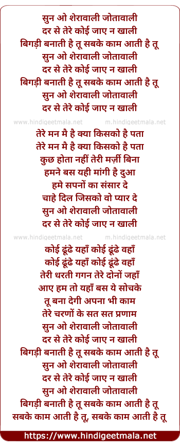 Lyrics of Sun Ao Sherawali Jotawali Dar Se Tere Koi Jaye Na Khali - सुन ओ शेरावाली जोतावाली दर से तेरे कोई जाए ना खाली