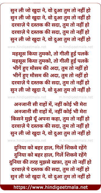 Lyrics of Sun Li Jo Khuda Ne Woh Duaan - सुन ली जो खुदा ने, वो दुआ तुम तो नहीं हो