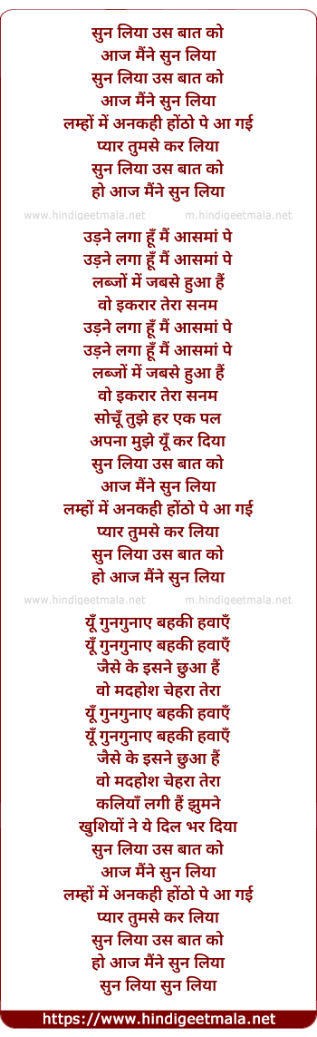 Lyrics of Sun Liya - सुन लिया उस बात को