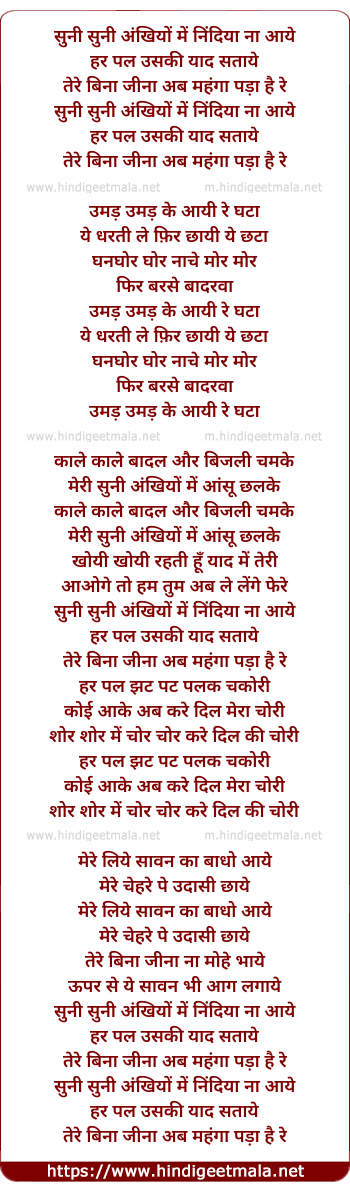Lyrics of Suni Suni Ankhiyon Me - सुनी सुनी अंखियों में निंदिया ना आये