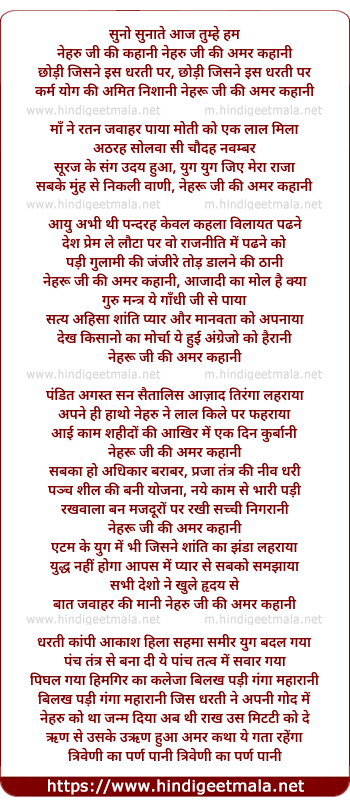 Lyrics of Suno Sunate Aaj Tumhe Hum Nehru Ji Amar Kahani - सुनो सुनाते आज तुम्हे हम नेहरु जी की अमर कहानी