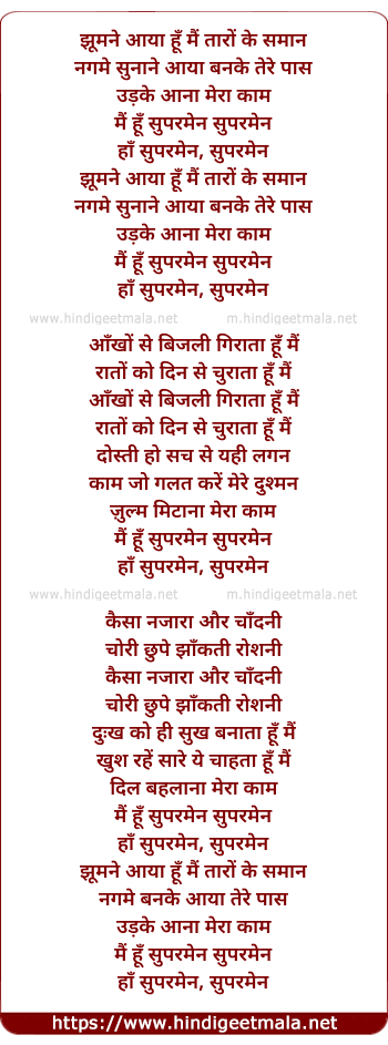 Lyrics of Superman - झूमने आया हूँ मैं तारों के समान
