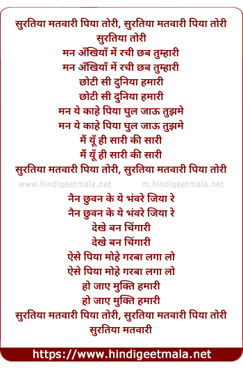 Lyrics of Suratiya Matwaari Piya Tori - सुरतिया मतवारी पिया तोरी, सुरतिया मतवारी पिया तोरी