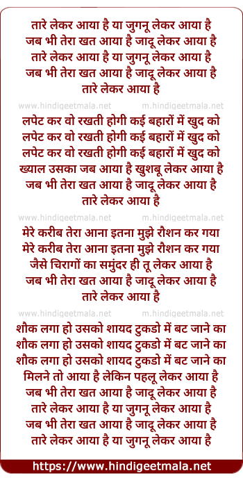 Lyrics of Taare Lekar Aaya Hai - तारे लेकर आया है या जुगनू लेकर आया है