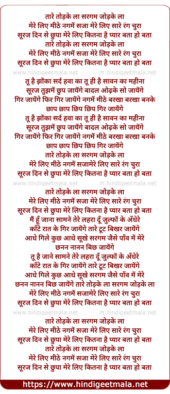 Lyrics of Taare Todke La, Sargam Jodke La - तारे तोड़के ला, सरगम जोड़के ला
