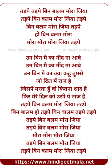 Lyrics of Tadpe Bin Baalam - तड़पे बिन बालम