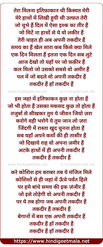 Lyrics of Takdeer - तेरा मिलना इतिफ़ाकान थी किस्मत मेरी