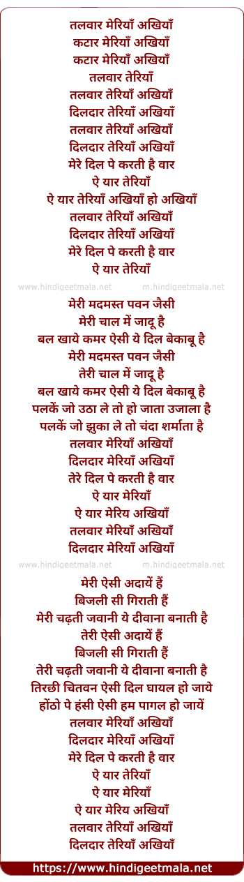 Lyrics of Talwar Teriyan Akhiyan - तलवार तेरियाँ अखियाँ